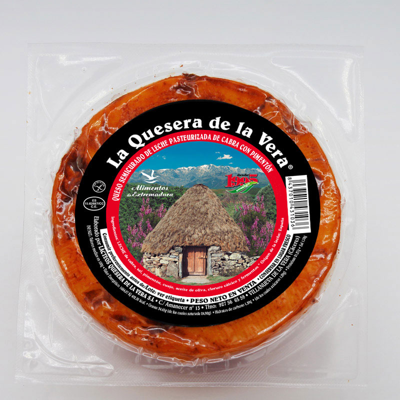 LECHE de cabra pasteurizada, sal, cuajo, cloruro cálcico y fermentos lácteos. Con Pimentón y aceite de oliva. Origen de la leche: ESPAÑA. Sin gluten.